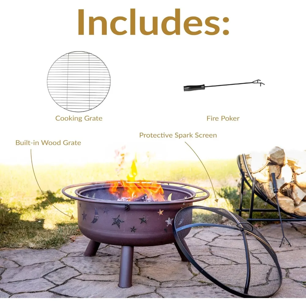 - HEAVY DUTY AND RUST RESISTANT: The backyard fire pit is made from durable steel and is finished with a rustic, high-temperature paint for long-lasting quality and added resistance to rust. The fire pit is lightweight and portable, allowing it to be moved anywhere easily. It has decorative star and moon cutouts that complement any outside decor style.