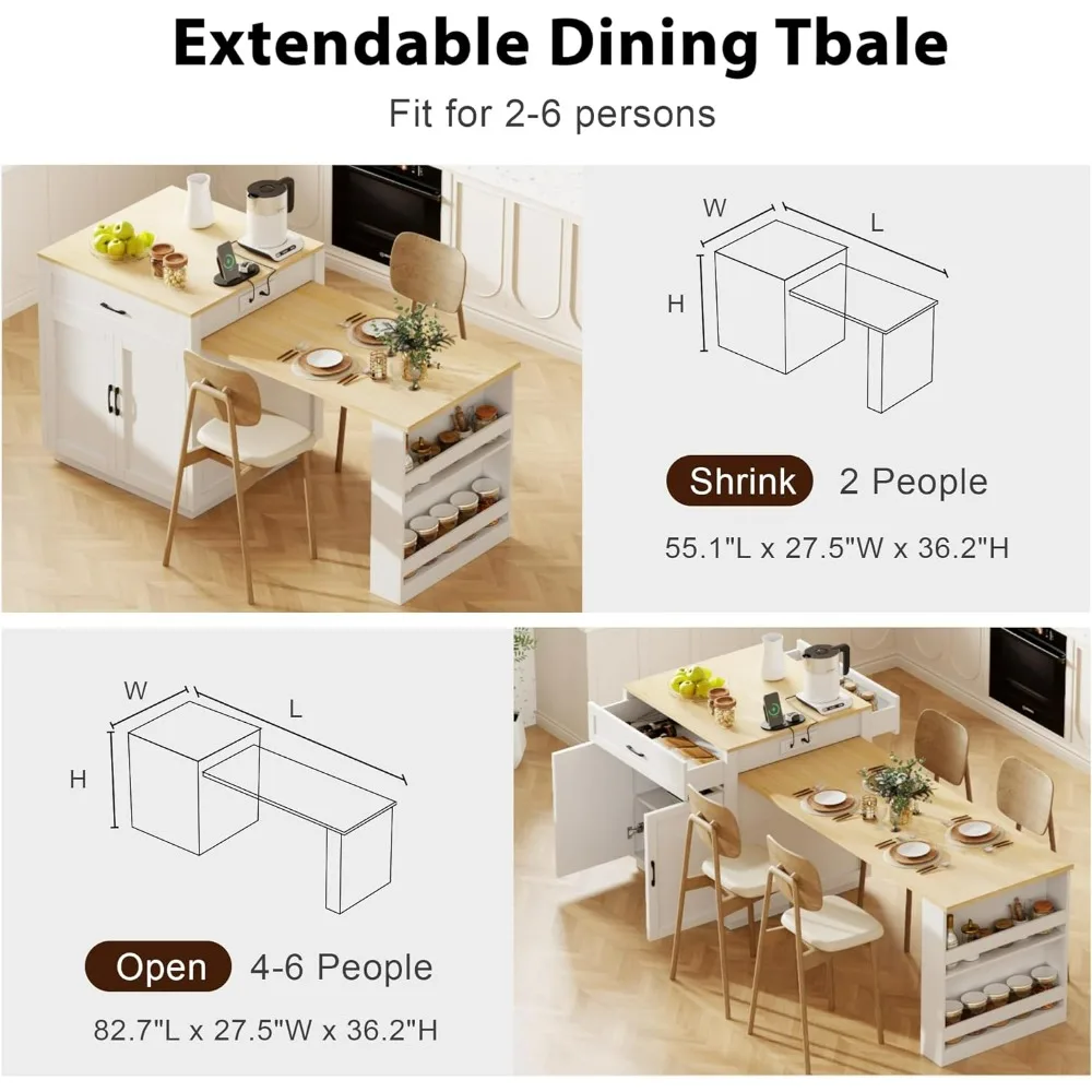 - 🏡【Extendable Dining Table】This large kitchen island with a dining table is designed to maximize small spaces and offers large storage. The food prep island cabinet measures 2ft by 2ft, while the extendable dining table features 2 lockable wheels for effortlessly moving and fixing. With a maximum length of 51.2", this table can seat up from 2 to 6 people.