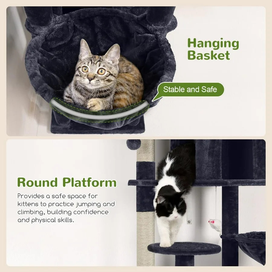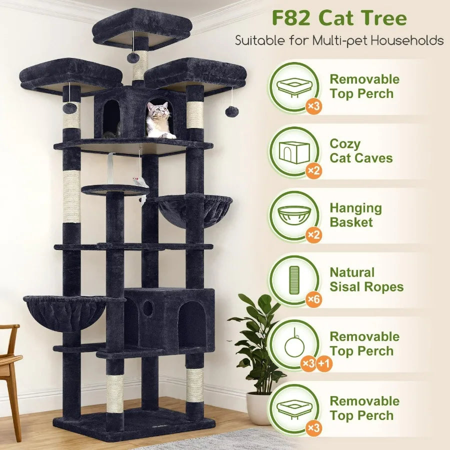 Adventure Awaits: This 82 inch tall cat tower with the tiered design creates a fun maze of platforms and walkways. 3 perches, 2 cat caves, and 2 hanging baskets allowing your cats to explore, climb, and lounge, turning every day into an exciting adventure