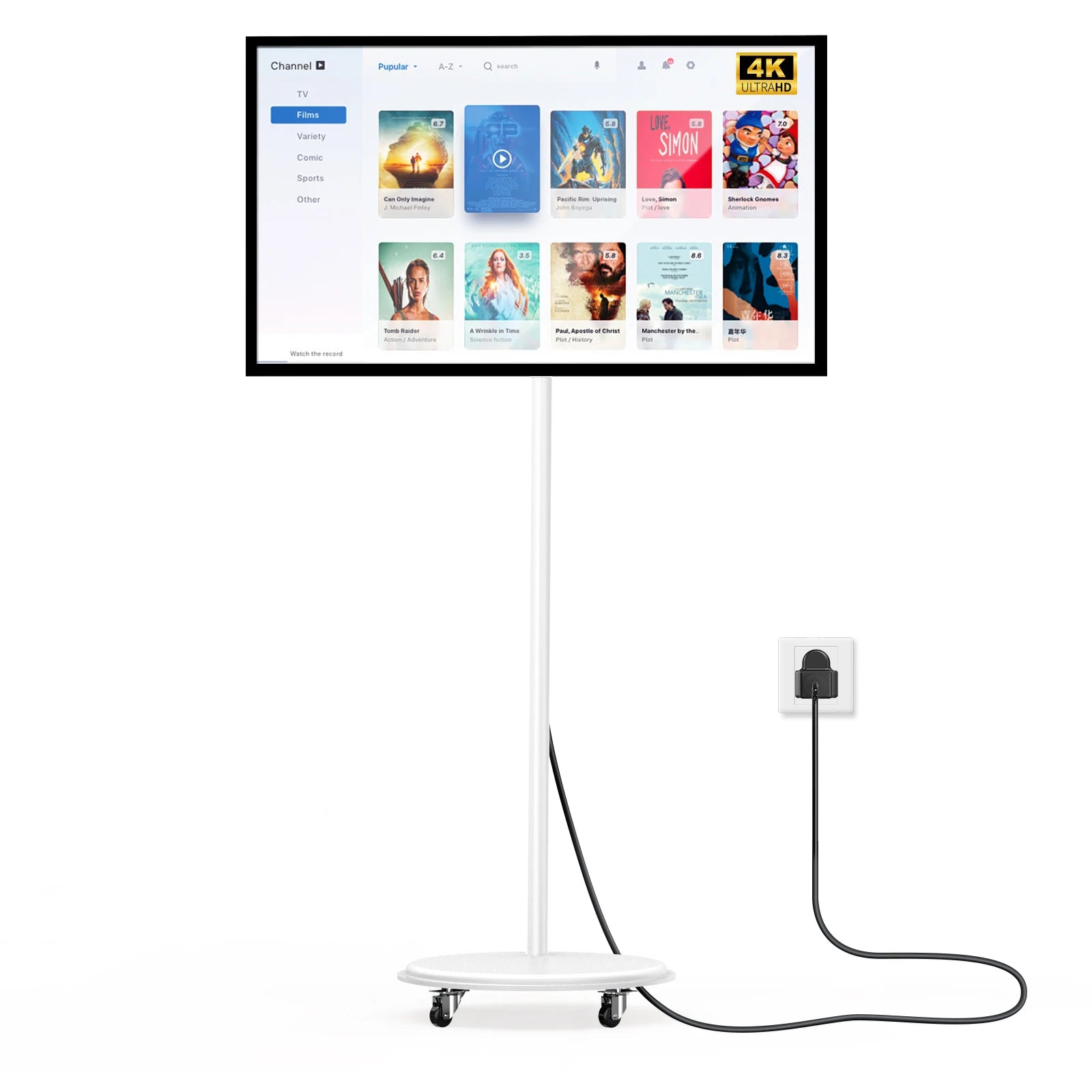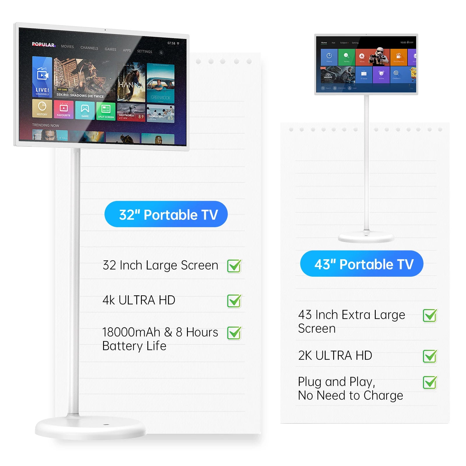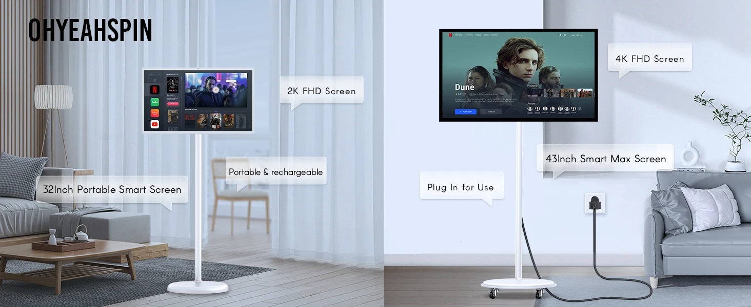 MWE 32/43-Inch Portable TV Smart Screen on Wheels, 2K Rotatable Monitor with Touchscreen, Android OS, 8H Video Playback Time