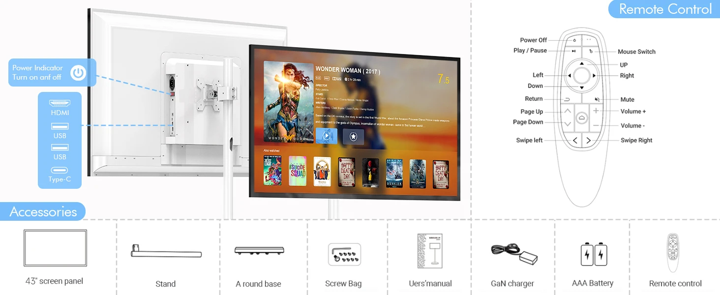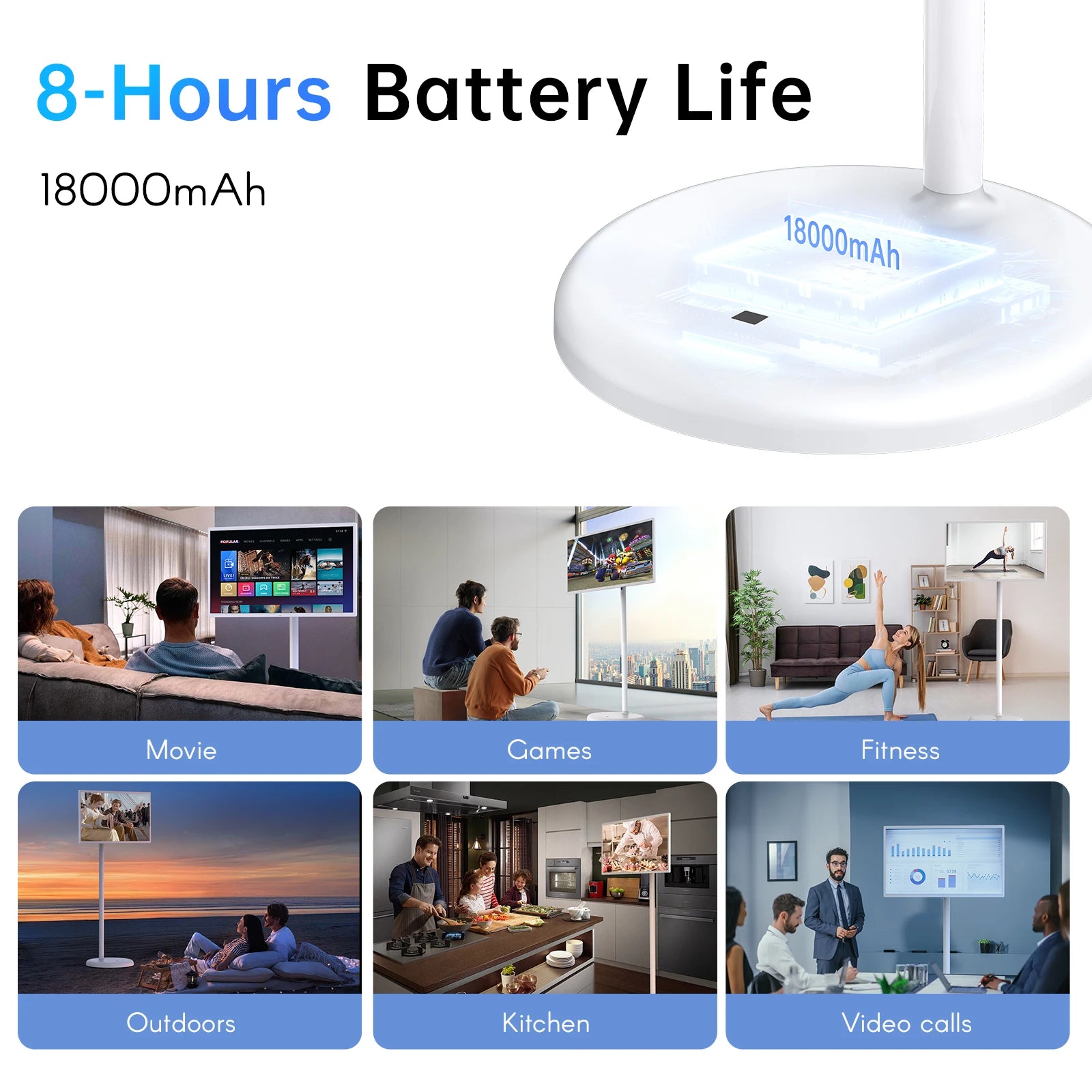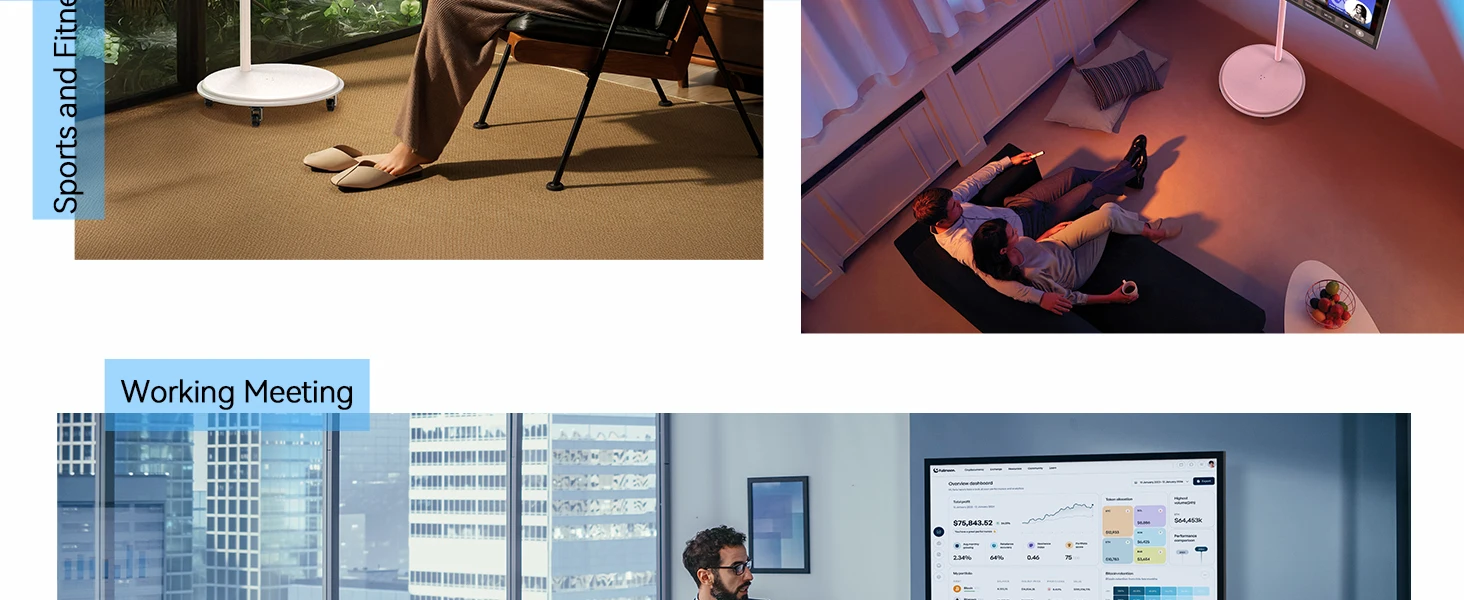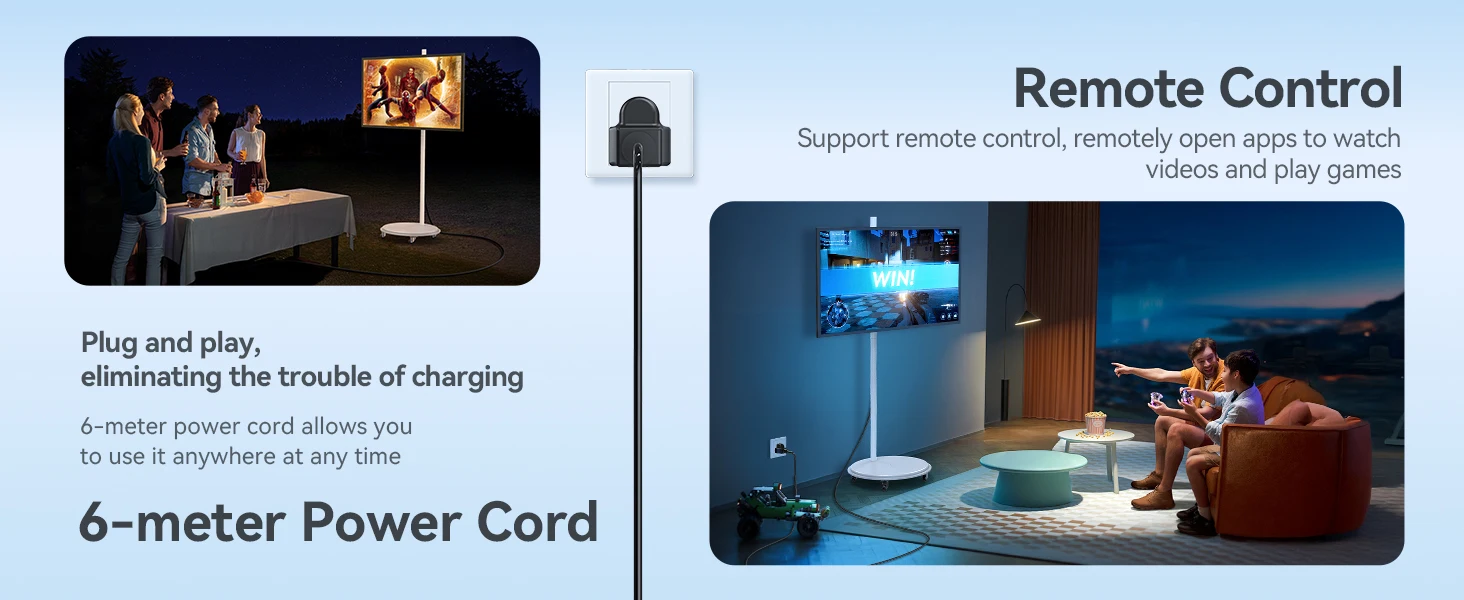[Wireless & Portable Design]: Equipped with wheels for easy mobility, plus 360° rotation, 20° tilt, and height adjustment (up to 6 inches) for the perfect viewing angle. Enjoy ultimate flexibility anywhere!