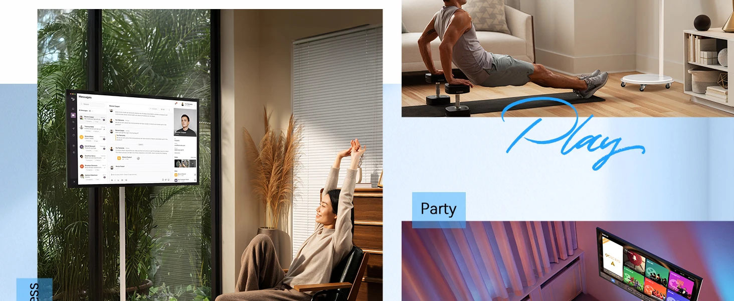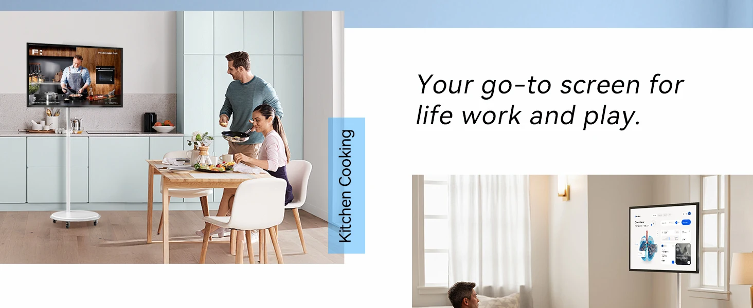 [Exclusive Entertainment & Leisure]: Move it freely around your home—portable smart screen with a 360° swivel base and dual speakers. Perfect for parties, gaming, and movies in the living room, dining room, kitchen, bedroom, or even outdoors.