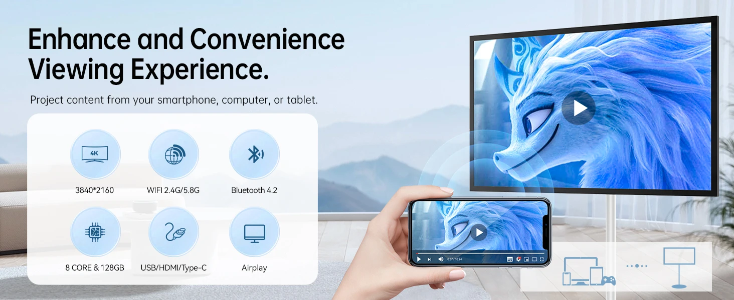 [Convenient Projection Feature]: Easily mirror content from smartphones, computers, or tablets onto the screen. Elevate your viewing experience with this versatile entertainment hub!