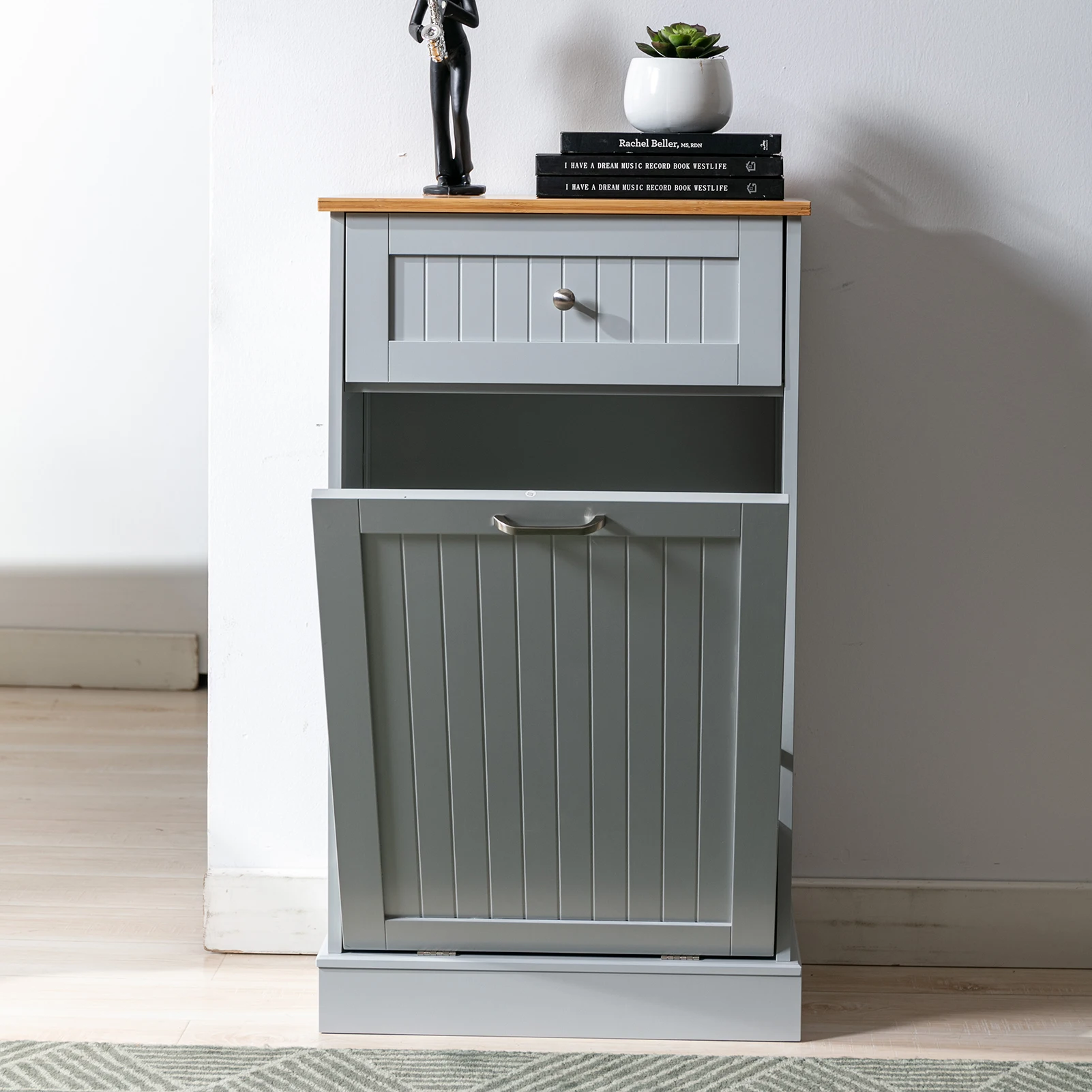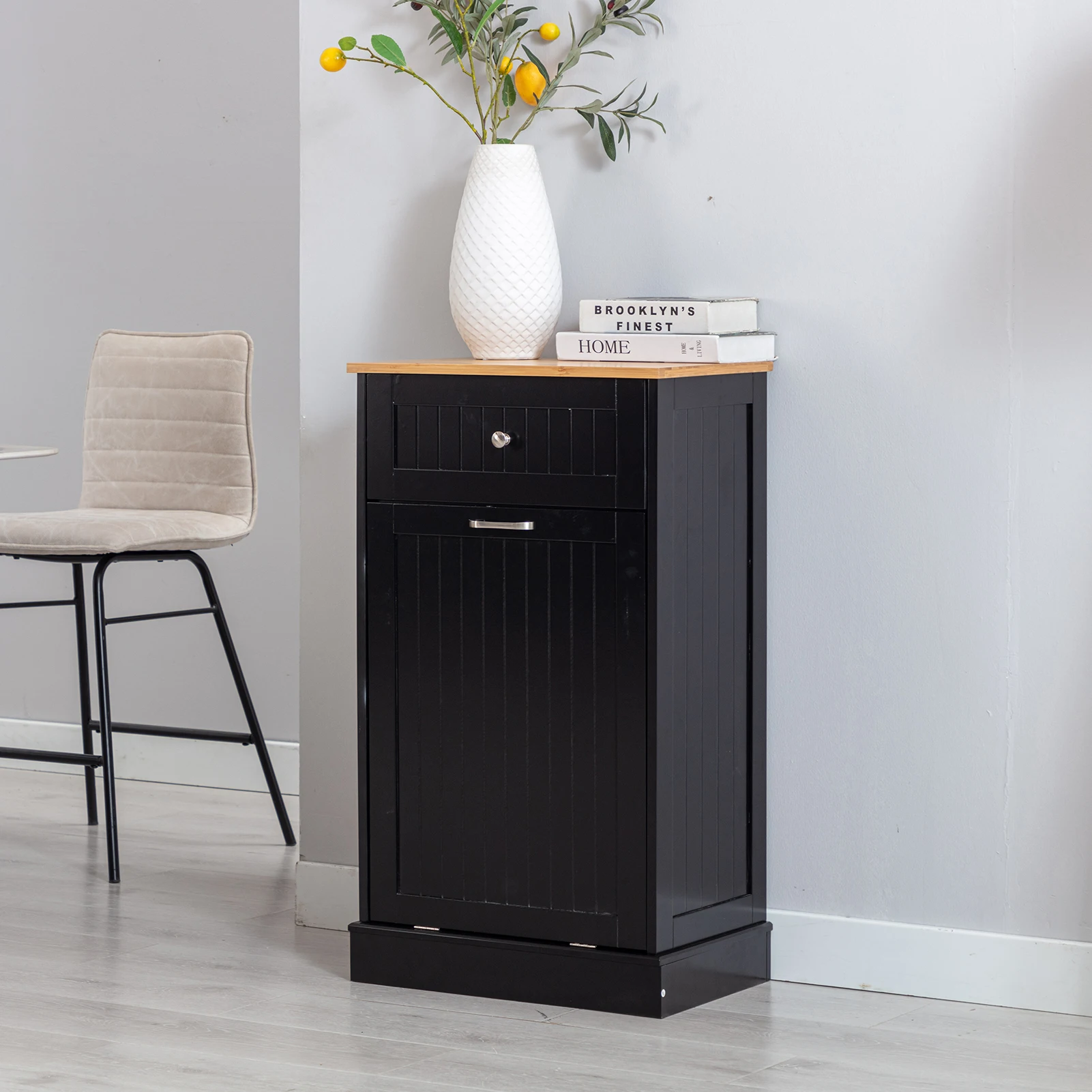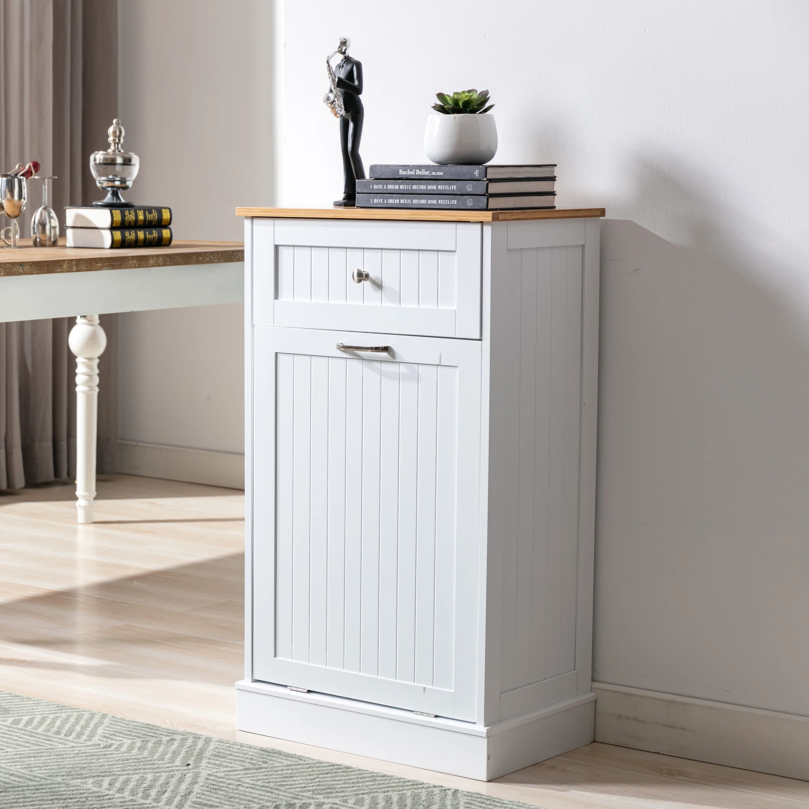 【Durable and Stable】 This kitchen trash cabinet can stand up to 10 gallan trash can and bamboo top surface is durable extra counter space and cleans easily can bear 66lb. Note: Trash Can Not Included.