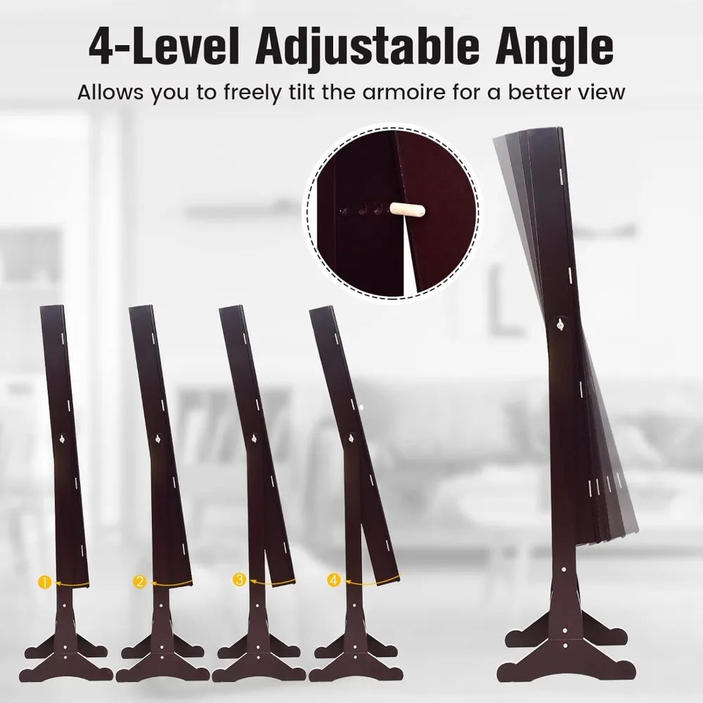 - [Full-length Mirror with 4 Angles]This jewelry cabinet comes with a large full-length mirror ( 42” x 14.5”) , allowing you to dress up and make up more conveniently. And the high-definition mirror can clearly reflect your appearance from head to toe. Moreover, it can can adjust the angle in 4 positions for better views.