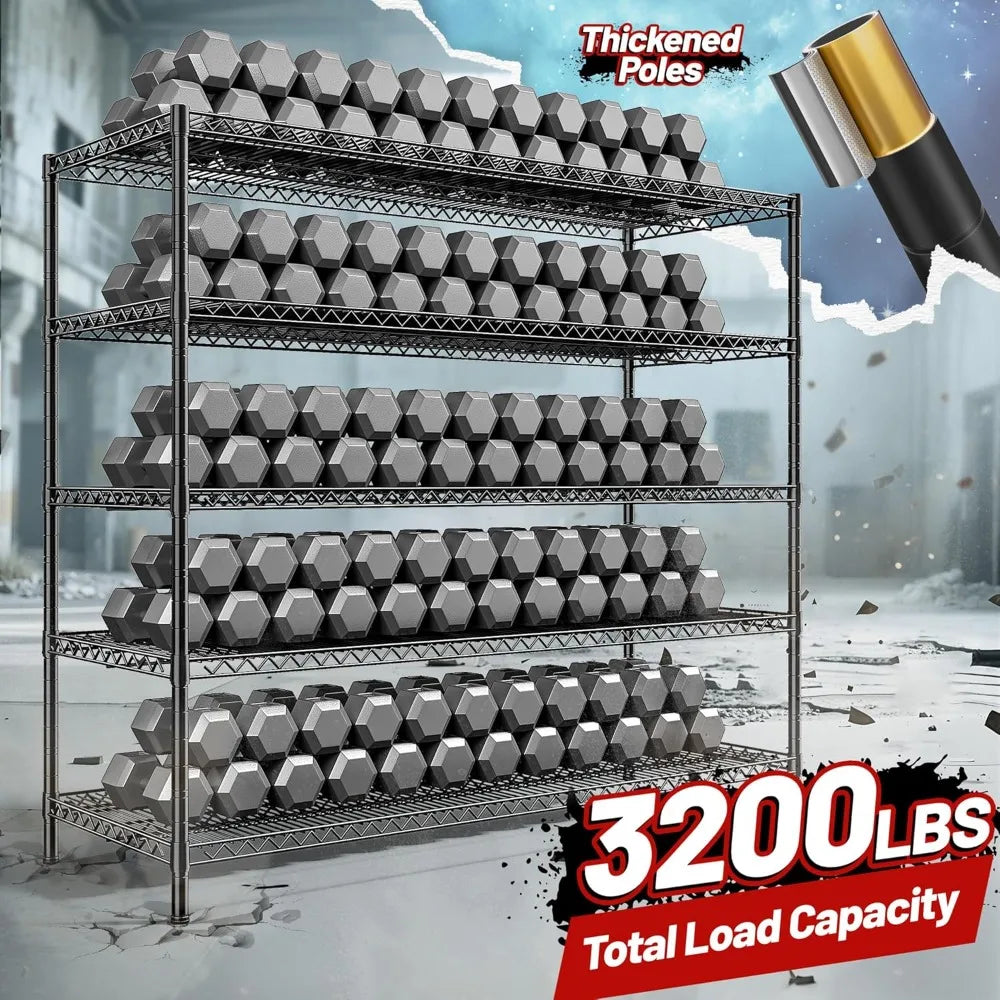 - [3200lbs Capacity Heavy Duty Wire Shelving Unit] Metal Shelving are made of sturdy heavy duty steel wire and 25.2mm diameter metal rods, with extra reinforced support bars on each Shelves of the metal, with a single tier load capacity of 640lbs and a total load capacity of 3200lbs.